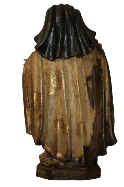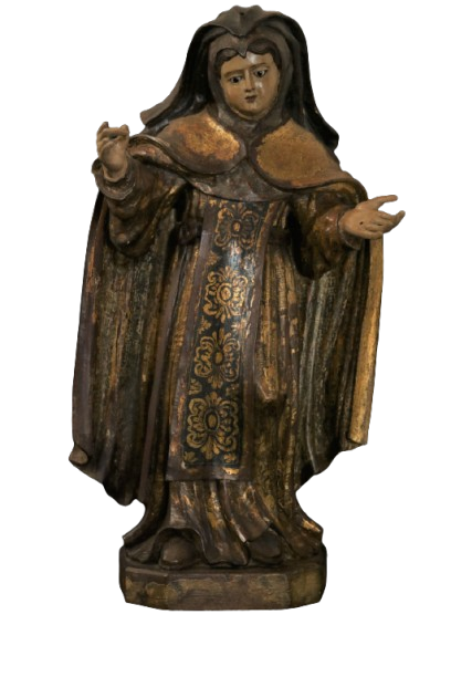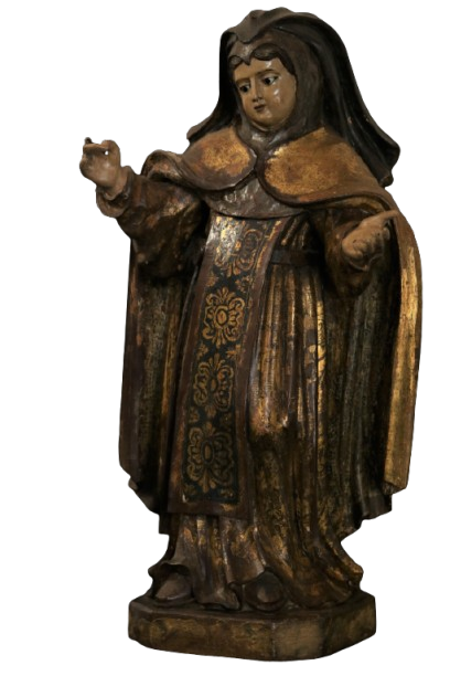 Figura feminina, meia-idade, de pé, em posição frontal, cabeça erguida à esquerda, olhos abaixados; braços flexionados a frente; mão direita de segurar (uma pena de prata*) e a mão esquerda espalmada (sustentava um livro aberto); perna direita reta e a esquerda flexionada; pés em ângulo; Vestida com hábito marrom cingido por correia preta, com padronagem em esgrafito e flores douradas; capa longa dourada; escapulário preto, com padronagem em motivos fitomorfos dourados; coifa marrom terminada em mantelete; véu marrom de bico; calçada com sapatos pretos; Base quadrada, de quinas chanfradas.